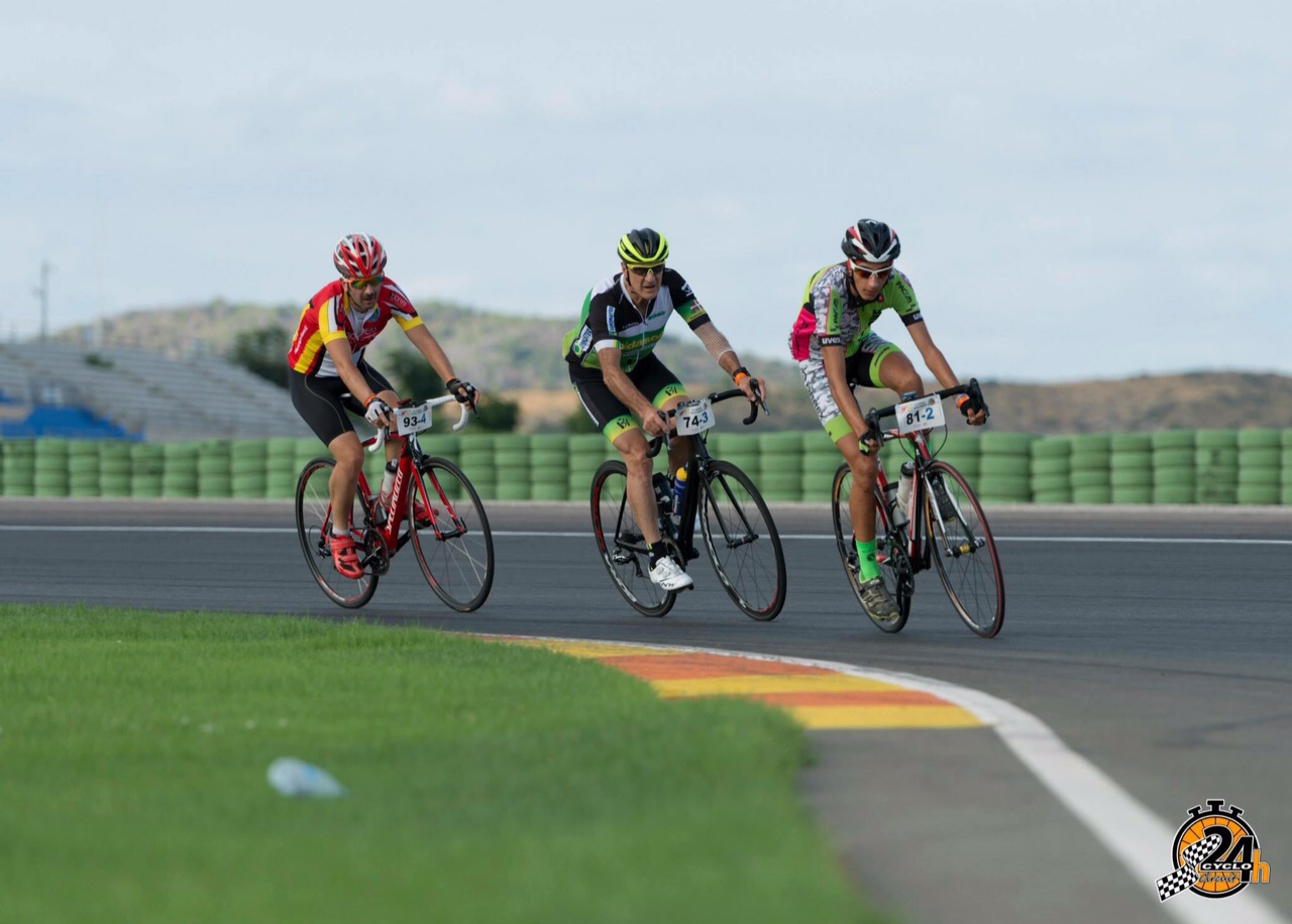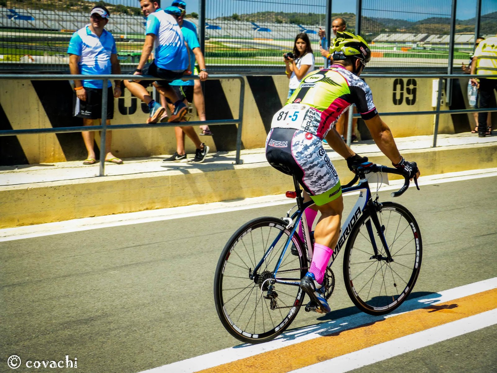 ¿En qué ha consistido esta prueba? Pues muy sencillo, en dar y dar y seguir dando vueltas al circuito de Cheste (Valencia) durante veinticuatro horas. El que conseguía dar más vueltas era el que se llevaba el gato al agua. Había diferentes formas de afrontar este reto: En individual o por equipos y en nuestro caso fue un equipo de ocho aguerridos gladiadores: Roberto, Arturo, Alberto, Rado, Dani, Javi, David e Ibán, (PLANTILLA) que fueron capaces de dar 211 vueltas, que son 846 km a una media de 35 km/h y superar 7500m de desnivel positivo, ¿desnivel?, sí, como podéis imaginar el circuito no es completamente llano aunque dé esa impresión por la televisión.