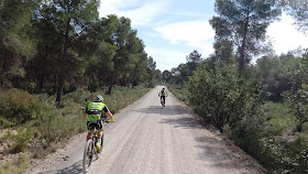 Tras un primer calentón (1 km al 7,5% de emdia) en la rampa del camino de la Font del Comte y pocos metros antes de llegar a ella, torcimos a la izquierda, poniendo las bicis definitivamente sobre tierra, coincidiendo con la entrada en la Provincia de Castellón.