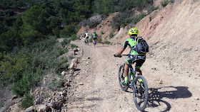 Ya arriba del todo, tras una parada en la que además de recuperar y juntarnos, estuvimos contemplando el valle entre la Calderona y Espadán, tocaba saborear el tramo descenso que nos tocaba hacer; el primero que podríamos considerar largo desde que salimos de Valencia y que concluyó el llegar al lecho del barranco de la Saborita. Otra vez a bajarse la cremallera del maillot y apretar.