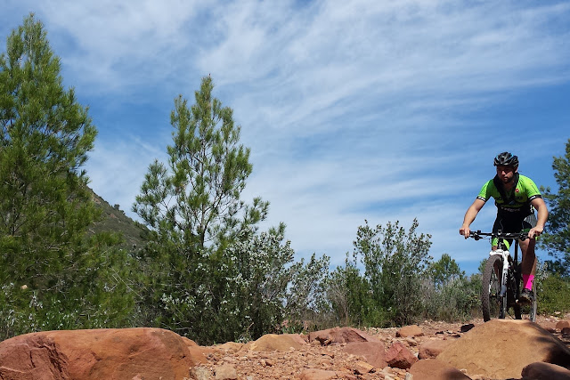 El camino de la Viuela fue el punto en el que se iniciaba el descenso que, prácticamente, no abandonaríamos hasta Valencia (con mayor o menor pendiente, claro). La primera parte de la bajada era más 'delicada', ya que las últimas lluvias han lavado a base de bien el camino de rodeno, dejando al descubierto mucha piedra angulosa suelta, creando cárcavas de considerable profundidad y escalones traicioneros.