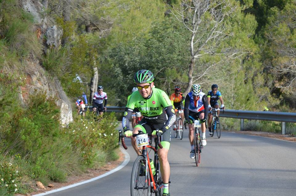 Salida puntual, a las 8, tras guardar un minuto de silencio por el trágico fallecimiento de Scarponi. Los 800 inscritos salimos por las calles de Gandía en dirección a Villalonga. Desde los primeros kilómetros se forman grupos a distintas velocidades y encuentro acomodo en uno que rueda a unos 35km/h. Poco dura la comodidad, en el km 15,5 empieza la primera subida de la jornada, el puerto de La Llacuna, todo un Segunda para empezar. El puerto no es muy largo, pero se hace duro. Los primeros 3 km no bajan del 10%, pero el remate, tras un pequeño 'descansillo' es un rampón al 16% que nos retuerce encima de la bici.